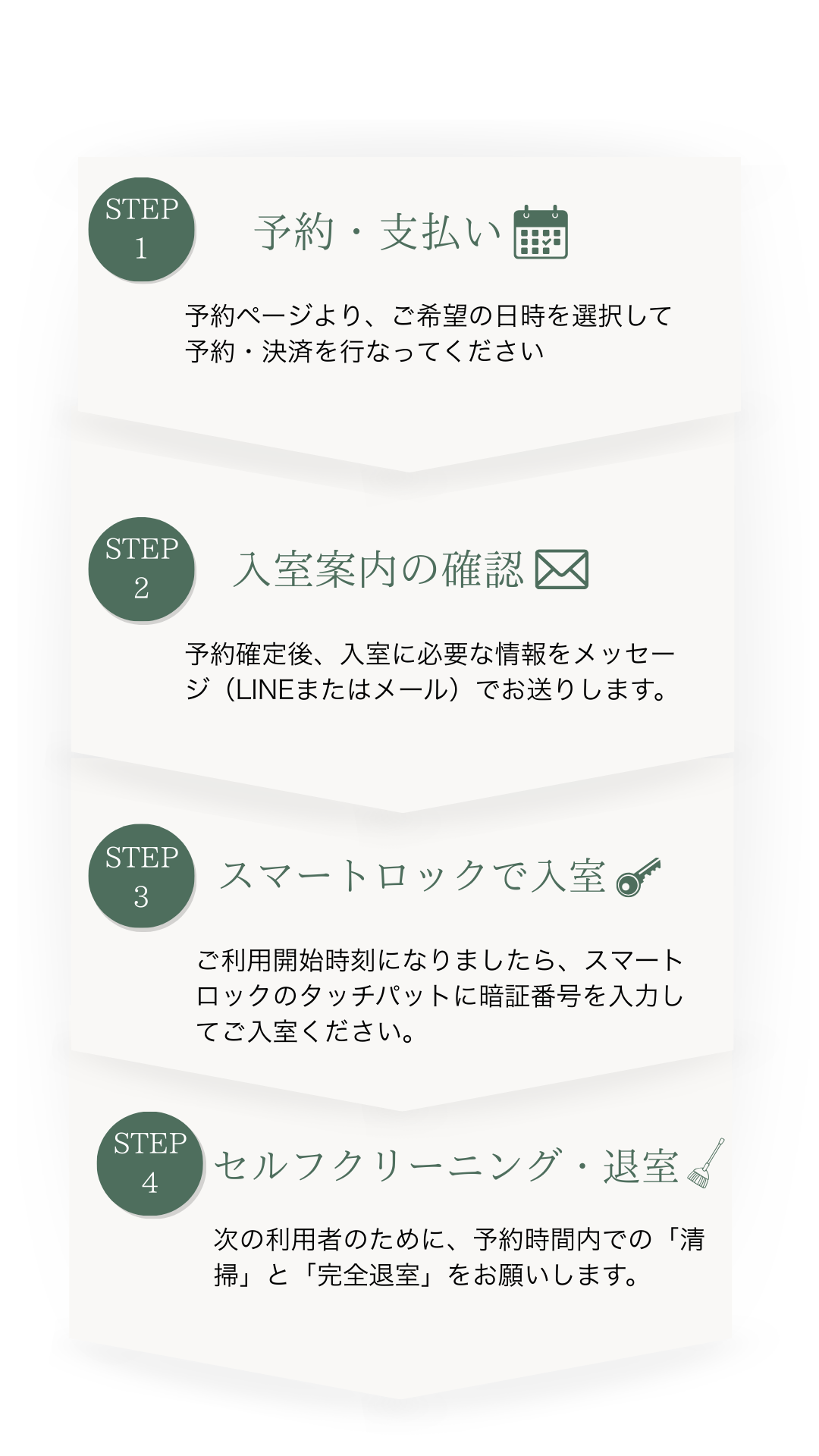 ※Web予約の場合、システムの関係上、入室用暗証番号のメールが届くまで数分程度のタイムラグが生じる場合がございます。お急ぎの方は、通知が即座に届く「公式LINE予約」をご利用ください。