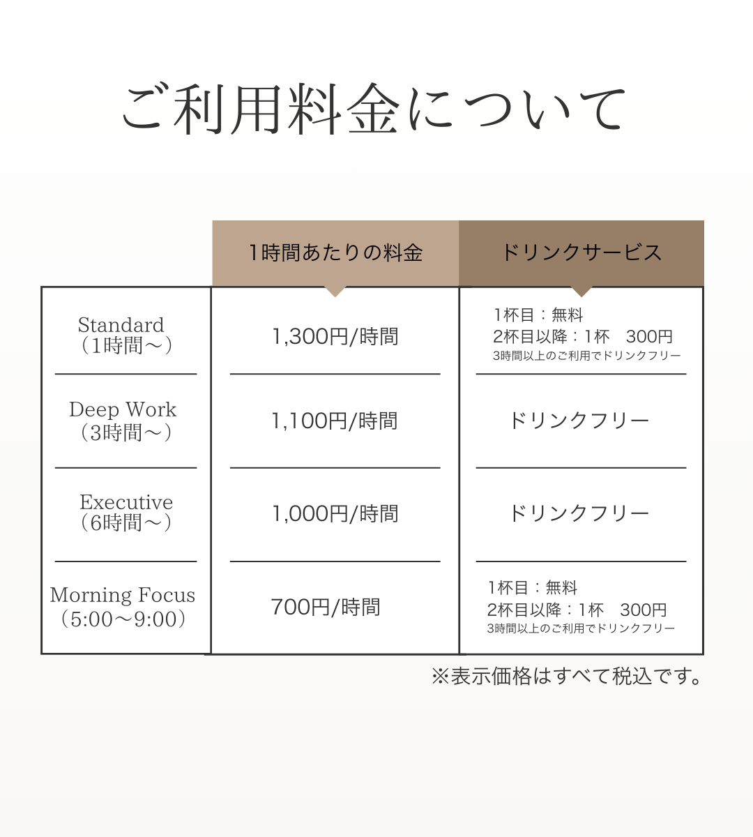 • ご利用料金 お一人様につき1杯まで無料でご利用いただけます。 2杯目以降は、500円で「お代わり自由」となります。